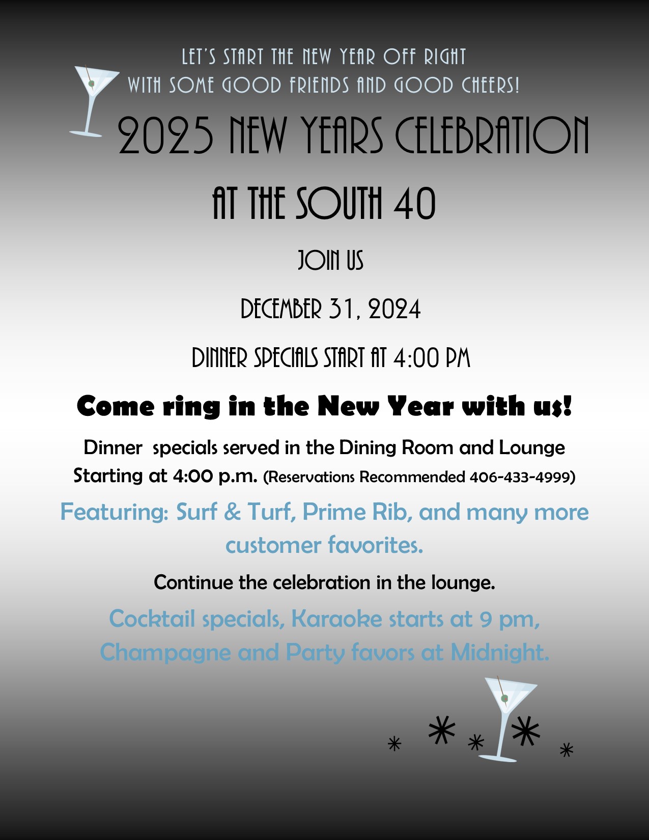 The South 40 is known for miles as the premier spot to feast on Cattle Company slow roasted, juicy, boneless prime rib or sizzling beef steaks. The comfortable rustic atmosphere has an elaborate soup and salad bar to accompany the wide assortment of entrées. There is a special menu for traveling sport's teams, a children's menu and an assortment of senior citizen and family favorites. We have something to make you smile, whatever your appetite fancies.